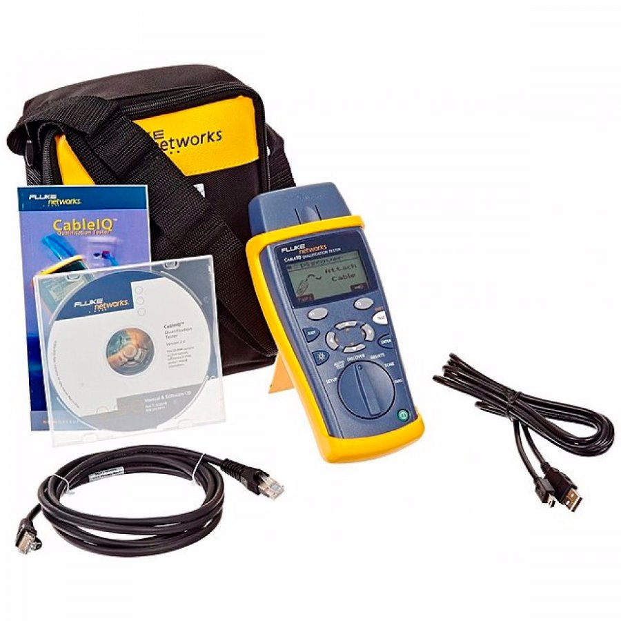 CIQ-KRQ - CableIQ, cabo patch RJ-45 (2), cabo patch RJ-11 (2), adaptador de fio descapado, adaptador de fio de altofalante, cabo coaxial, adaptador coaxial BNC, adaptador coaxial RCA, rótulos de "Qualificado" (50) e um estojo de transporte leve.